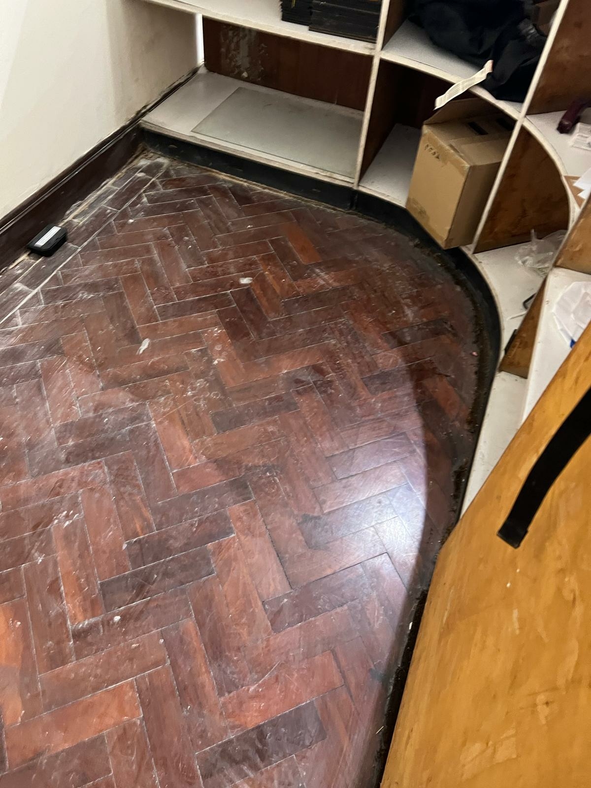 Another parquet job in Covent Garden. This one needed some prep work before sanding could start -- gap filling, some boards to sort out, and an old finish to strip back completely. The sanding went through cleanly once the prep was done.